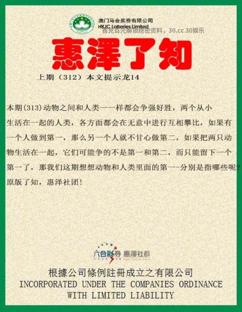 【惠泽了知】313期:动物之间和人类一一样都会争强好胜,两个从小生活在一起的人类,各方面都会在无意中进行互相攀比,如果有一个人做到第一,那么另一个人就不甘心做第二,如果把两只动物生活在一起,它们可能争的不是第一和第二,而只能留下一个第一了,那我们这期想想动物和人类里面的第一—-分别是指哪些呢?原版了知,惠泽社团! 【惠泽九肖】:猪猴蛇羊牛狗龙虎马 【惠泽平尾】:222 |