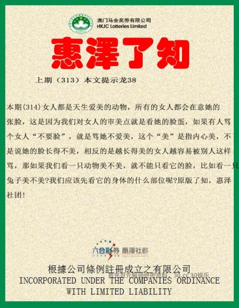 【惠泽了知】314期:女人都是天生爱美的动物,所有的女人都会在意她的张脸,这是因为我们对女人的审美点就是看她的脸蛋,如果有人骂个女人“不要脸”,就是骂她不爱美,这个“美”是指内心美,不是说她的脸长得不美,相反的是越长得美的女人越容易被别人这样骂,那如果我们看一只动物美不美,就不能只看它的脸,比如看一只兔子美不美?我们应该先看它的身体的什么部位呢?原版了知,惠泽社团! 【惠泽九肖】:虎兔鸡马羊狗鼠猴猪 【惠泽六肖】:虎兔鸡马羊狗 【惠泽特码】:16.28.03.15.21.33.24.36.11.23 【惠泽平肖】:猪猪猪 【惠泽平尾】:888 |